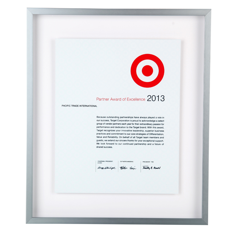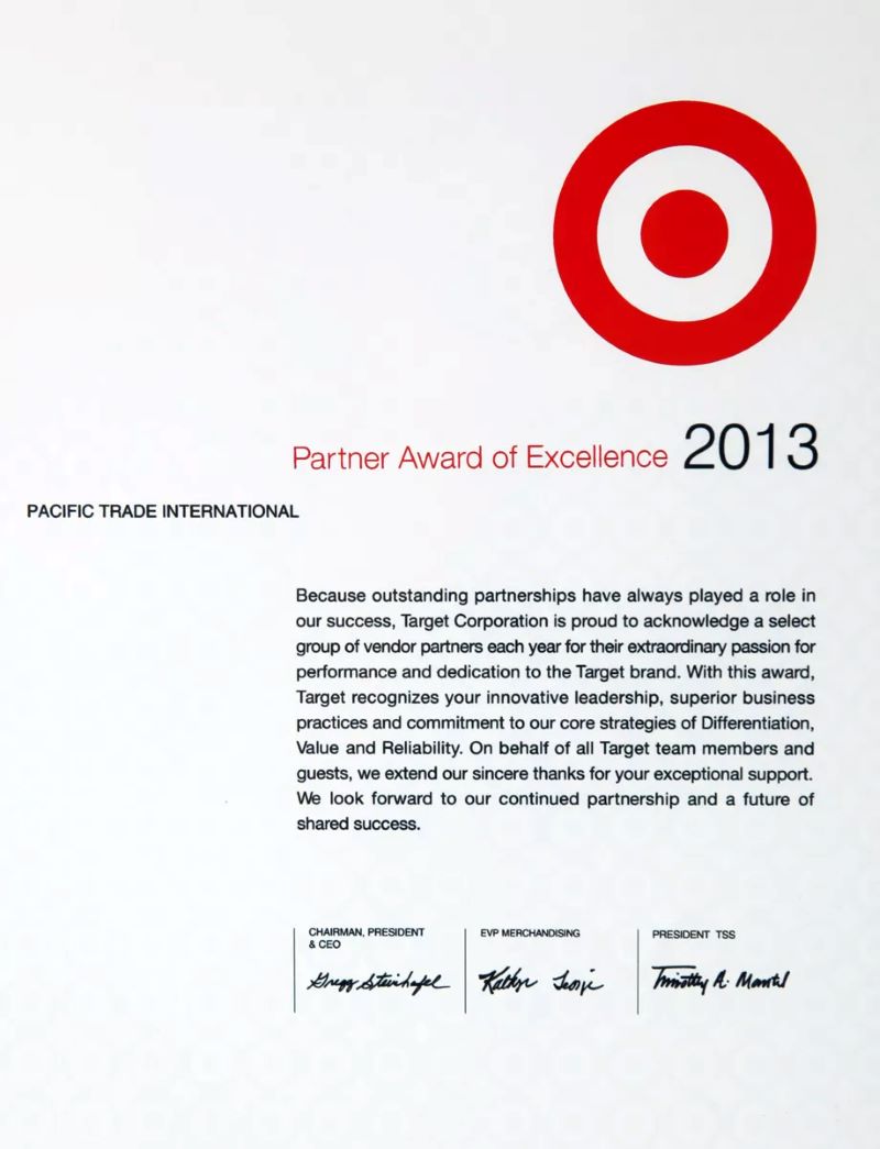 Because outstanding partnerships always play a significant role in our success, Target Corporation annually selects some of our best partners from among our vendors to recognise their outstanding performance and appreciation for their contributions to the Target brand. Through this award, Target recognises your innovative leadership, business excellence and commitment to our core strategy of ‘difference, value and reliability’. On behalf of all Target employees and customers, we would like to thank you for your exceptional support. We look forward to a continued partnership and a win-win future with you.